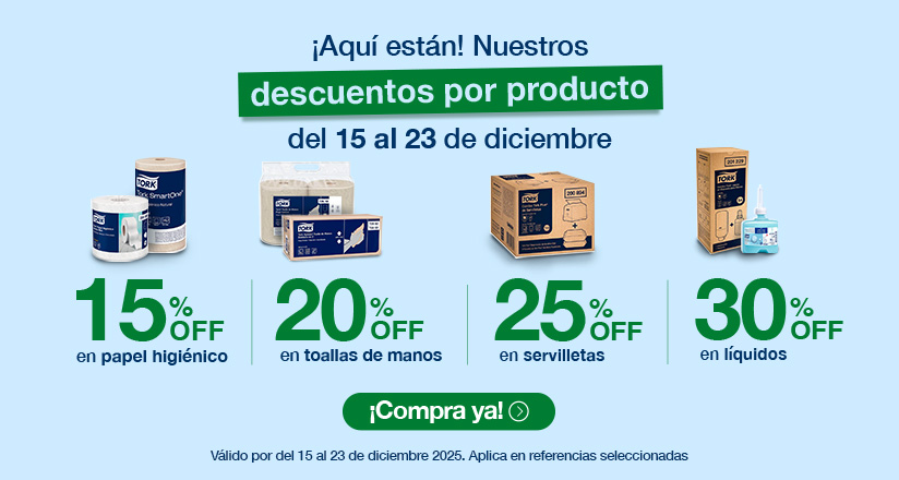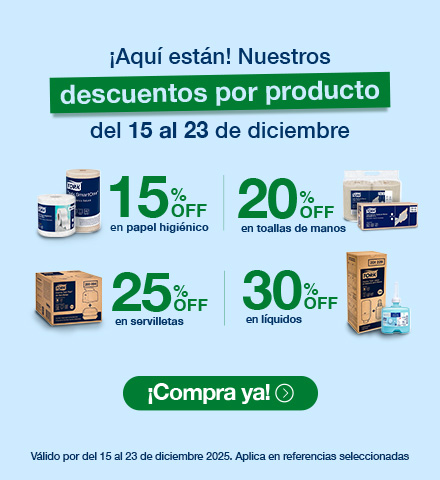 Tork® ofrece productos y servicios de higiene profesional a clientes de todo el mundo, desde restaurantes e instalaciones sanitarias hasta oficinas, escuelas e industrias. Nuestros productos combinan calidad, funcionalidad, sustentabilidad y ahorro.