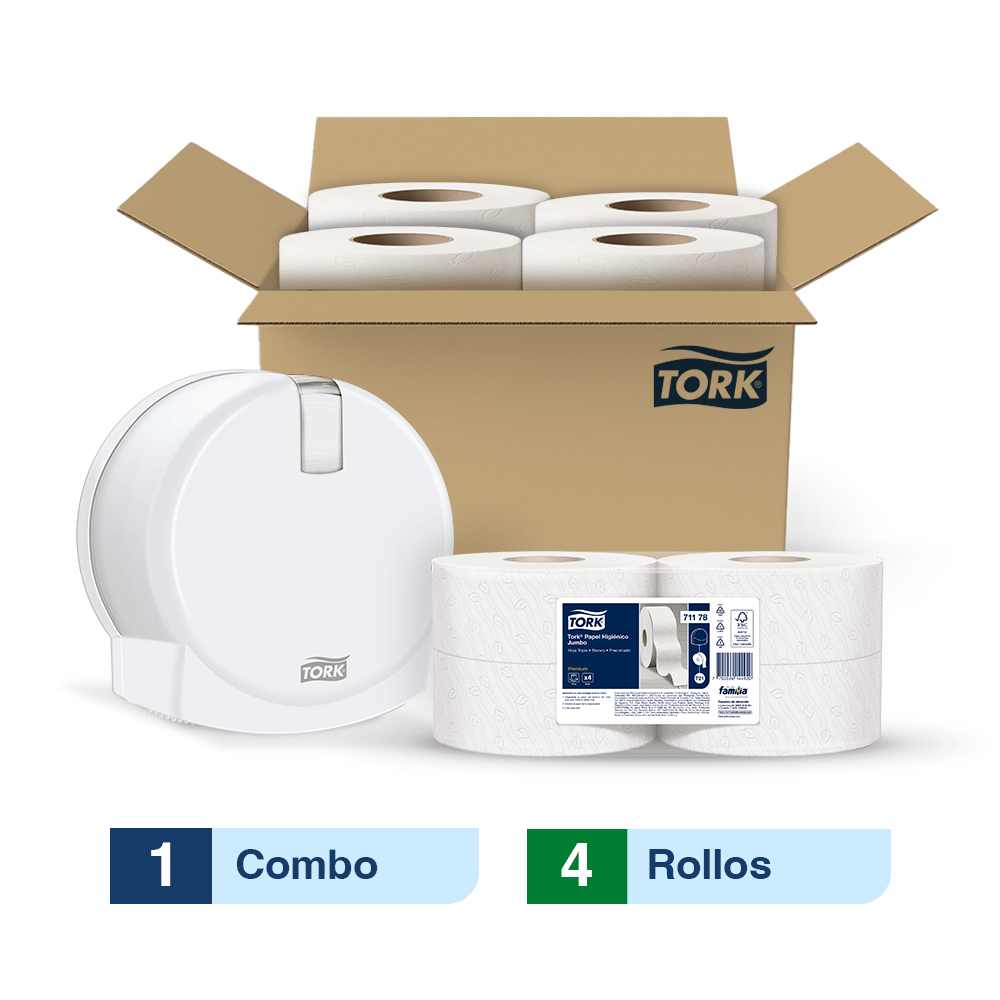 Combo Tork® Dispensador de Papel Higiénico Jumbo /Premium/ Blanco + Caja x4 rollos x 170 m