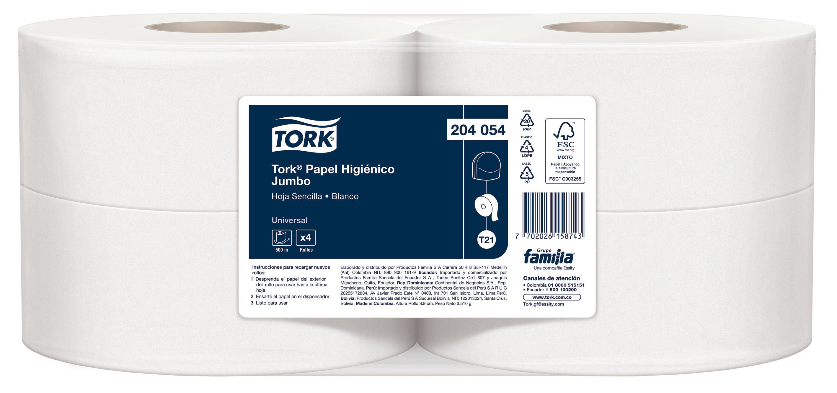 Tork® Papel Higiénico Jumbo/Universal/ Blanco/ 500 m / 4 rollos