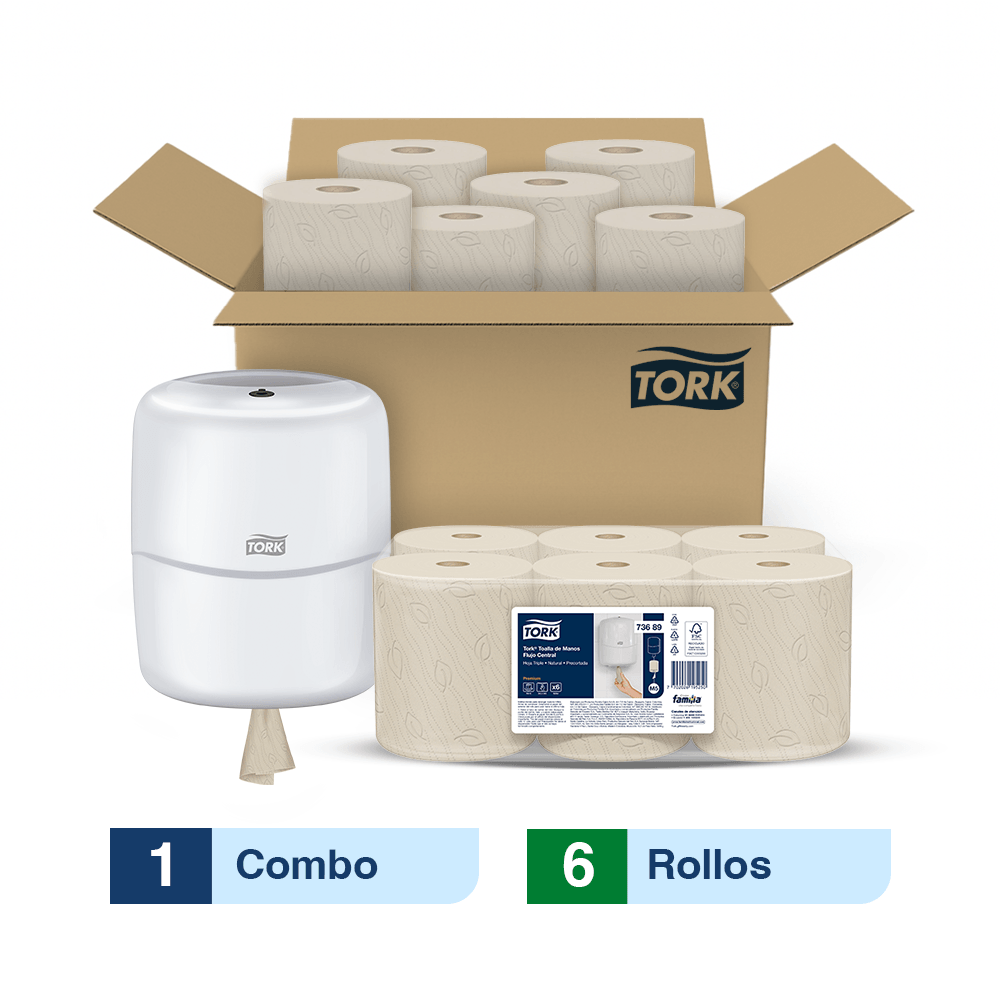 Combo Tork® Dispensador Toalla de manos Flujo Central / Premium/ Natural +Caja x6 rollos x100 m